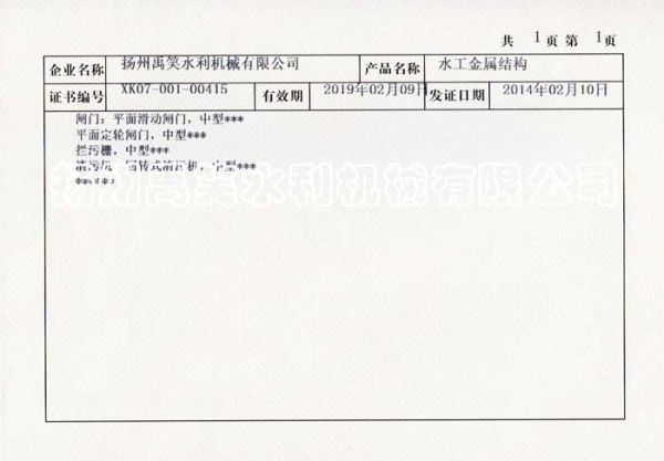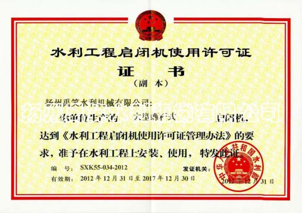 | 持证单位: 扬州禹笑水利机械有限公司 |